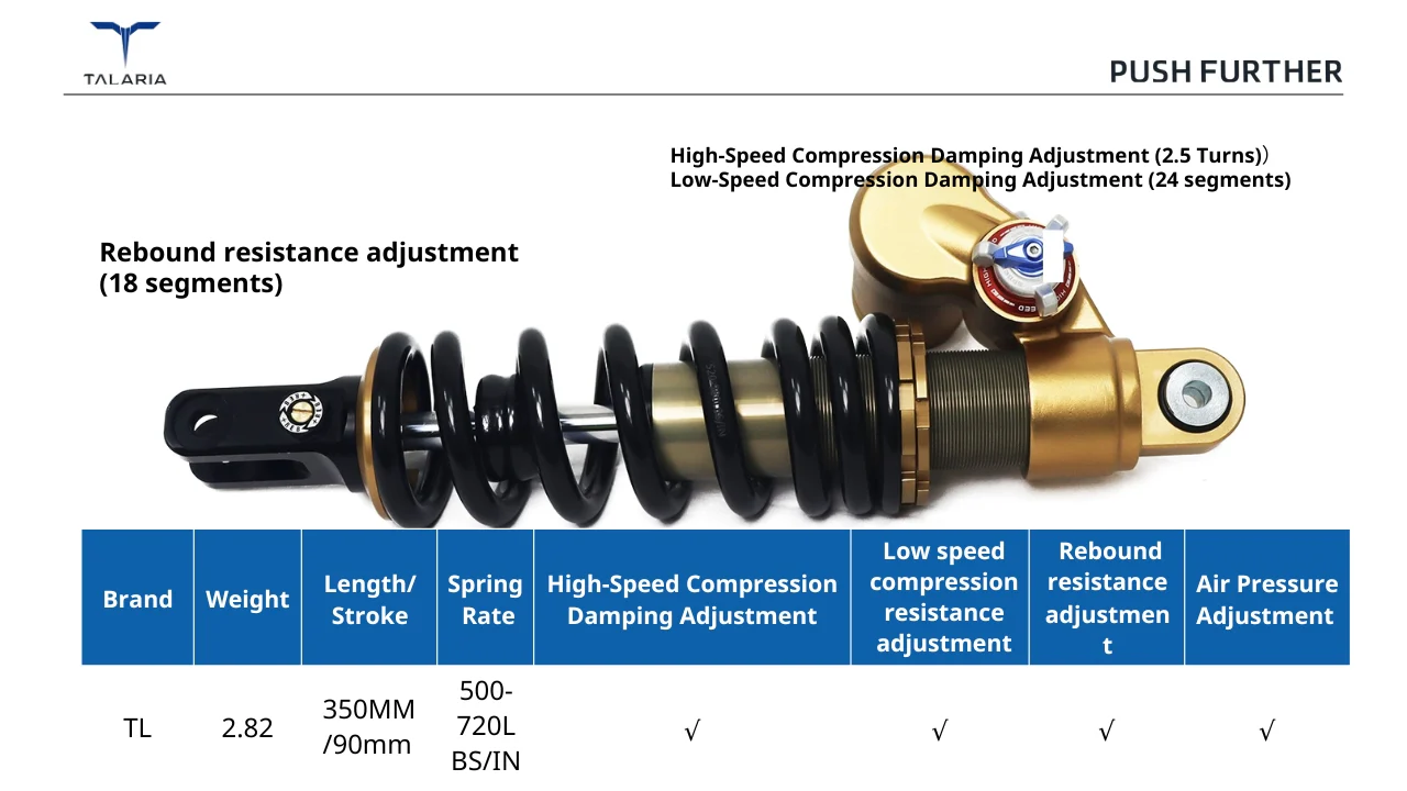 Rear Shock: 350 mm travel, 90 mm stroke, 500–720 lbs spring